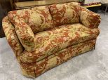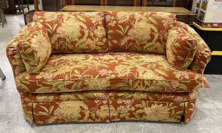 Sherrill Upholstered Single Cushion Sofa, throw cushions, skirted, floral pattern, 6'. Sherrill Upholstered Single Cushion Sofa, throw cushions, skirted, floral pattern, 6'.