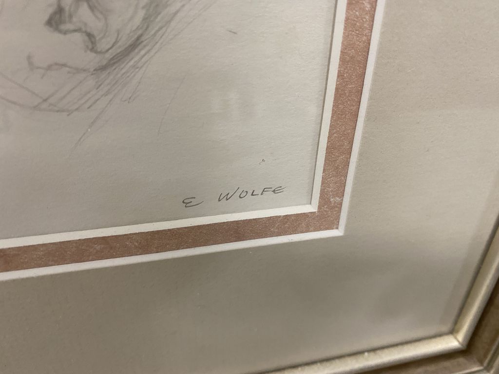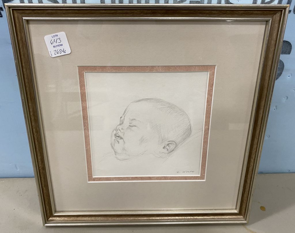 Elizabeth Wolfe Baby Sketch, signed lower right, matted, framed, 12" x 12". Mississippi artist. Elizabeth Wolfe Baby Sketch, signed lower right, matted, framed, 12" x 12". Mississippi artist.