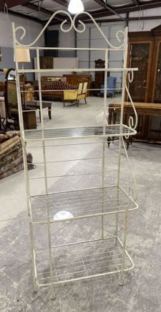 White Baker's Rack, two glass shelves, four shelves total, painted white, iron, 74"h., 30"w., 16"d. White Baker's Rack, two glass shelves, four shelves total, painted white, iron, 74"h., 30"w., 16"d.