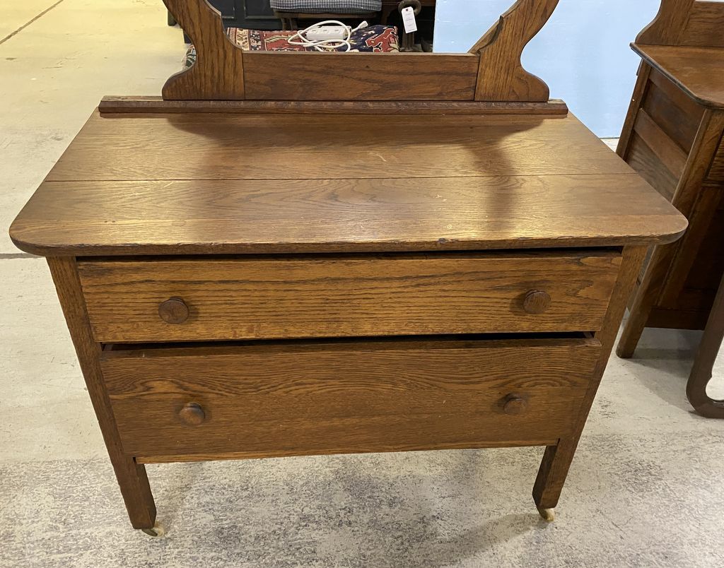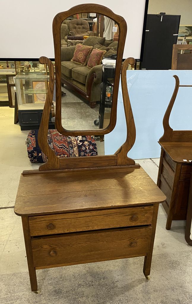 Vintage Oak Dresser, Two drawers, top mirror, on caster, light finish wear, 66"h., 34"w., 19"d. Vintage Oak Dresser, Two drawers, top mirror, on caster, light finish wear, 66"h., 34"w., 19"d.