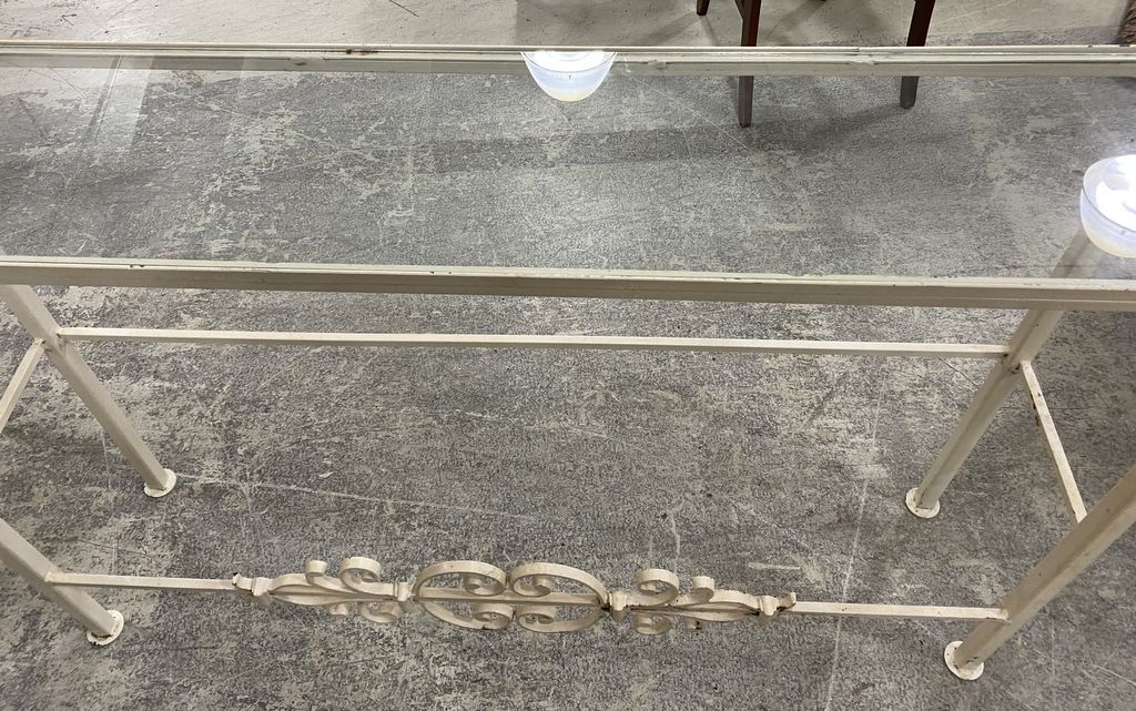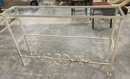 White Painted Iron Console Table, glass top, 32"h., 49"w., 11"d. White Painted Iron Console Table, glass top, 32"h., 49"w., 11"d.
