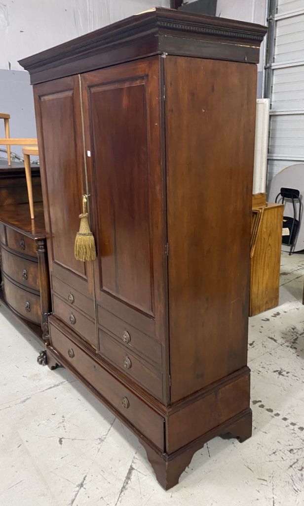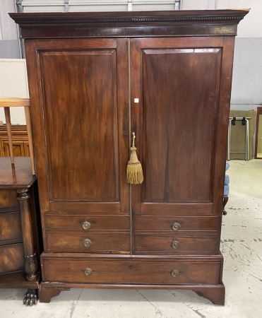 Antique Mahogany Linen Press, double door, top comes off, burl mahogany, single drawer, no inner shelves, will need tightening, 79"h., 54"w., 20"d. Antique Mahogany Linen Press, double door, top comes off, burl mahogany, single drawer, no inner shelves, will need tightening, 79"h., 54"w., 20"d.