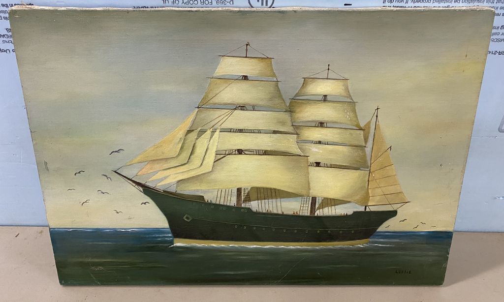 Ship Painting by Leslie, on canvas, signed lower right, unframed, 18"h., 26"w. Ship Painting by Leslie, on canvas, signed lower right, unframed, 18"h., 26"w.