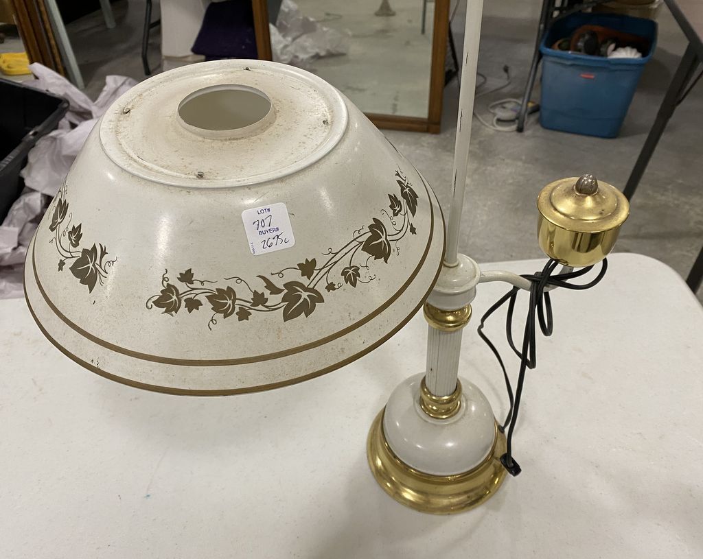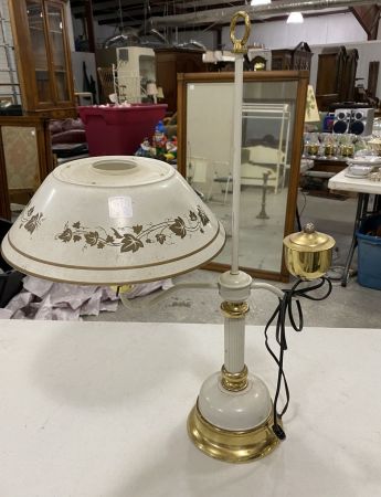 White Vintage Tole Desk Lamp, metal shade, milk glass shade, 25"h. White Vintage Tole Desk Lamp, metal shade, milk glass shade, 25"h.