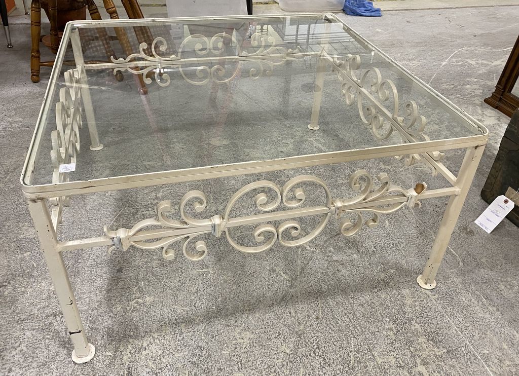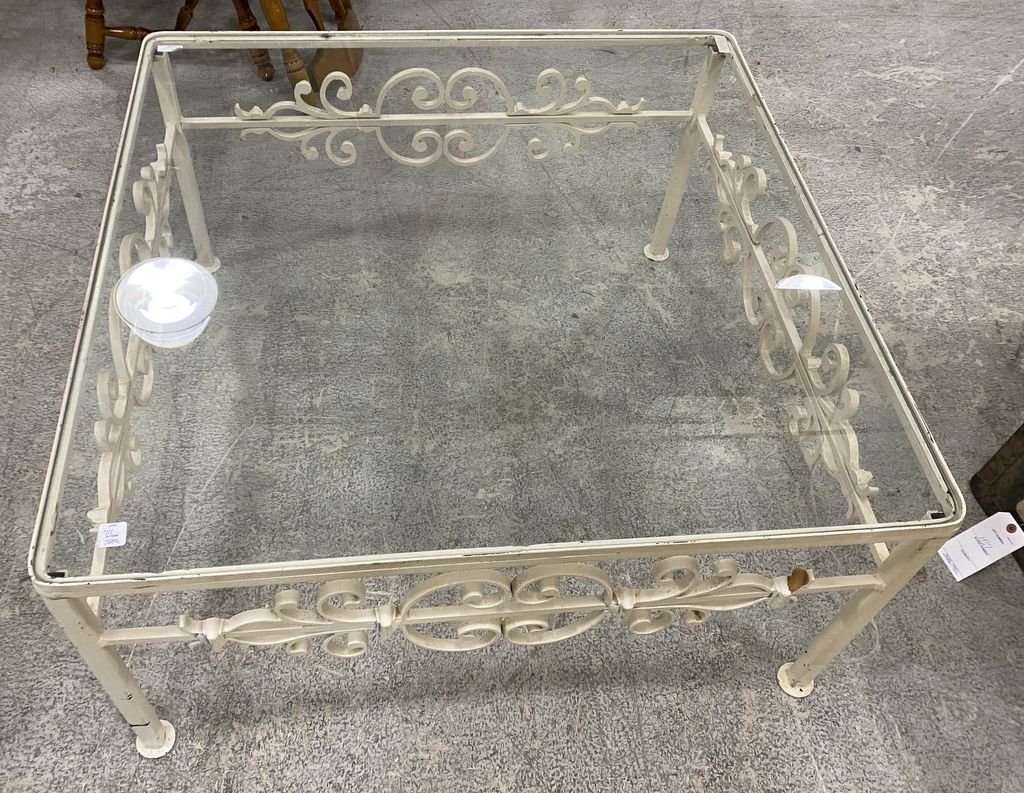 White Painted Iron Square Coffee Table, glass top, 19"h., 36"w. White Painted Iron Square Coffee Table, glass top, 19"h., 36"w.