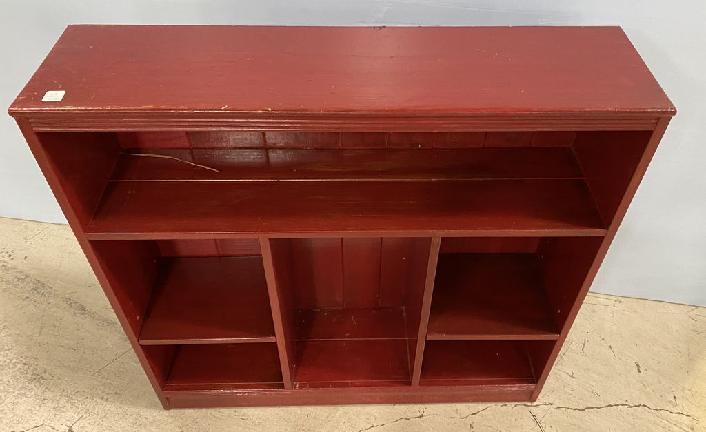Red Painted Bookcase, light finish, 35"h., 36"w., 9"w. Red Painted Bookcase, light finish, 35"h., 36"w., 9"w.