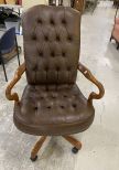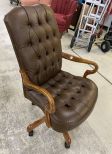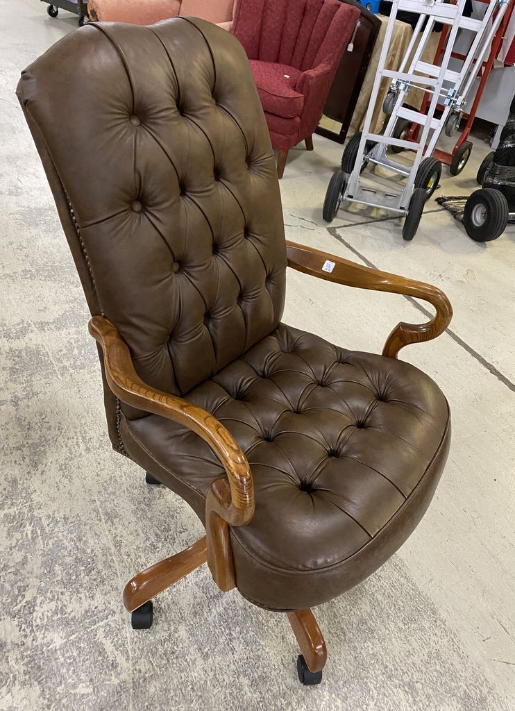 Leather Tufted Desk Chair, button tufted, oak, on wheels, swivel, good condition, 44"h. Leather Tufted Desk Chair, button tufted, oak, on wheels, swivel, good condition, 44"h.