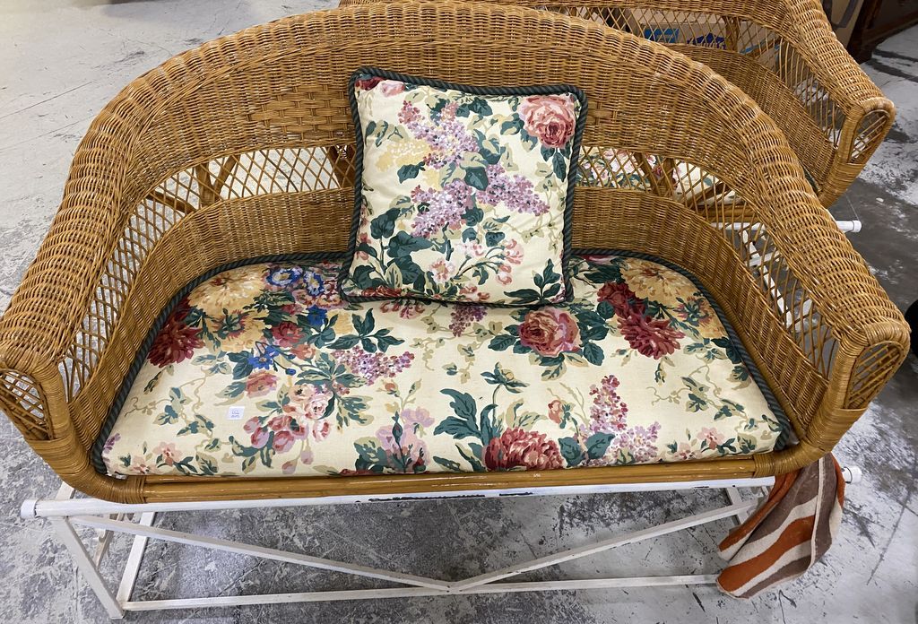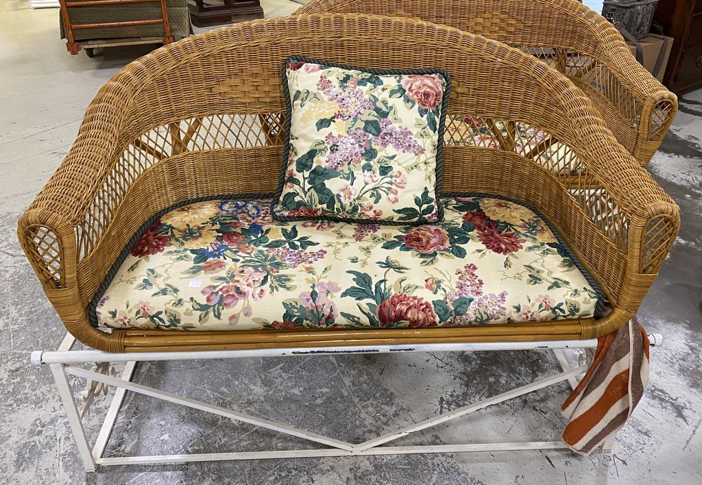 Wicker Bench on Iron Base, good condition, 36"h., 54"w. Wicker Bench on Iron Base, good condition, 36"h., 54"w.