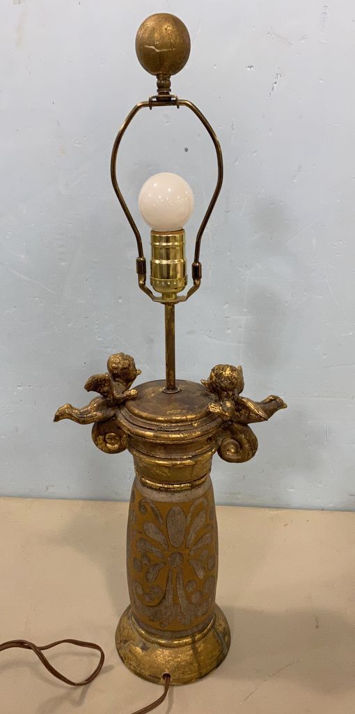 Gold Gilt Cherub Wood Lamp, distressed style, included shade, 26"h. Gold Gilt Cherub Wood Lamp, distressed style, included shade, 26"h.