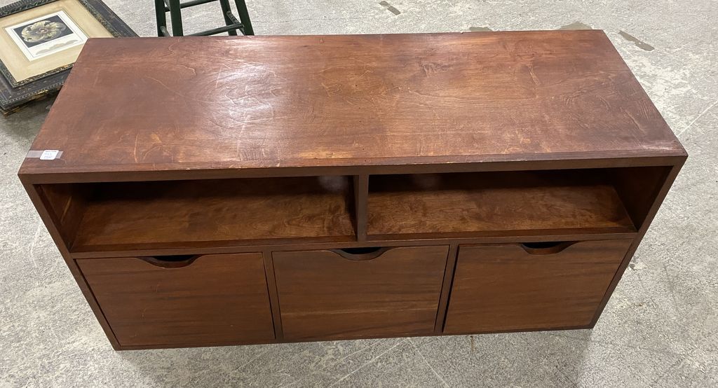 Hand Made TV Stand, Three drawers, stained, two open front shelves, 24"h., 48"w., 18"d. Hand Made TV Stand, Three drawers, stained, two open front shelves, 24"h., 48"w., 18"d.