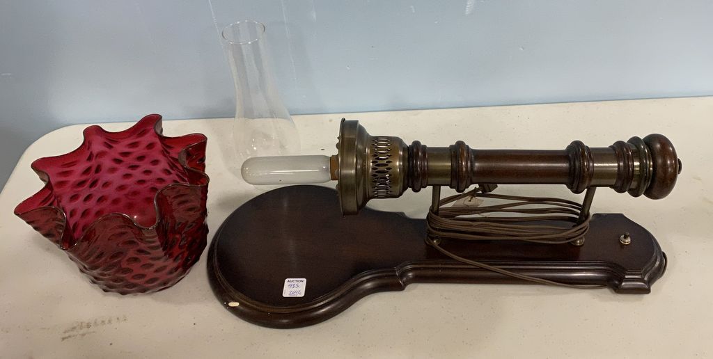 Antique Reproduction Wall Sconce light fixture, red crimped glass shade, with hurricane shade, 23"h. Antique Reproduction Wall Sconce light fixture, red crimped glass shade, with hurricane shade, 23"h.