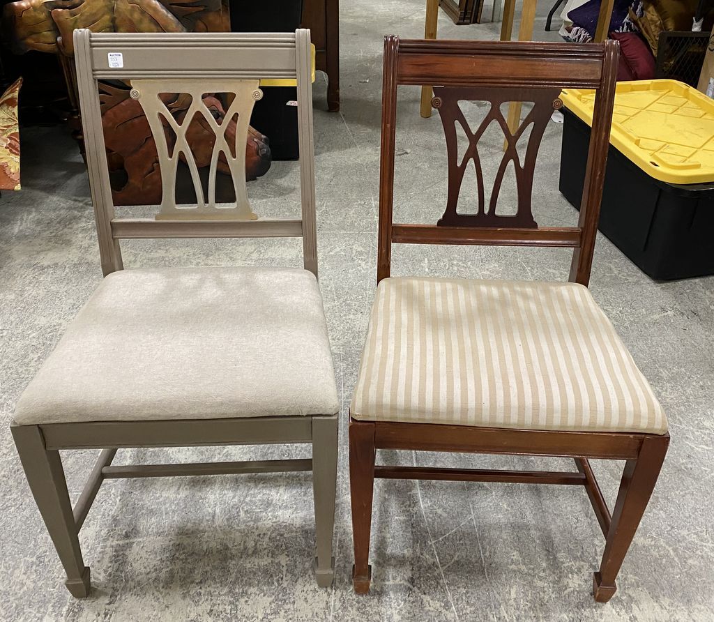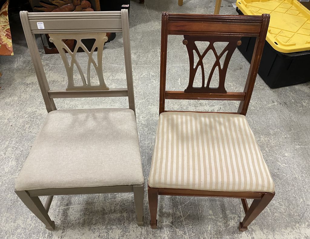 Two Sheraton Style Side Chairs, one natural finish with striped cushion, other painted with solid color cushion. Two Sheraton Style Side Chairs, one natural finish with striped cushion, other painted with solid color cushion.