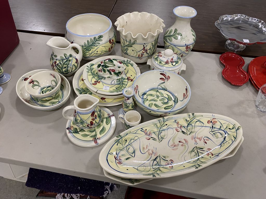 Large Group of Gail Pittman Pottery, dishes, platters, bowls, vases, charger, plates, creamer, candle sticks, cup, pitchers. Large Group of Gail Pittman Pottery, dishes, platters, bowls, vases, charger, plates, creamer, candle sticks, cup, pitchers.