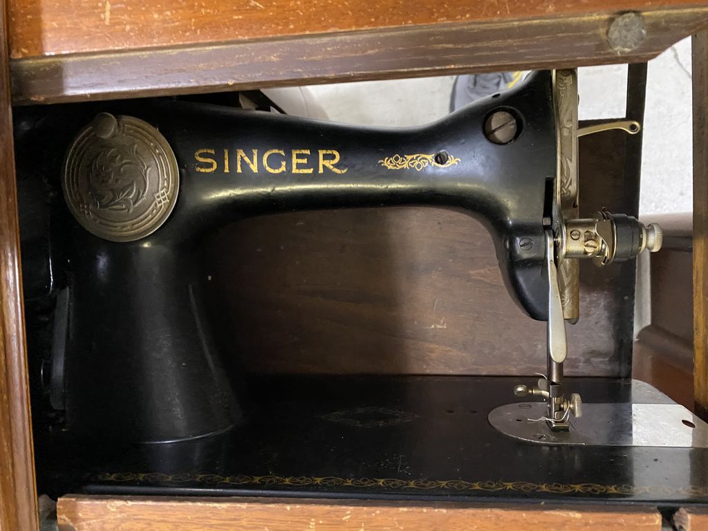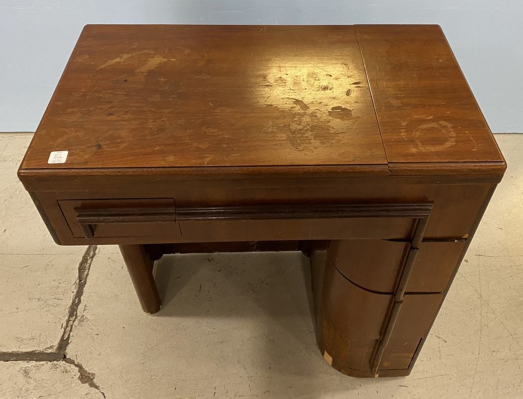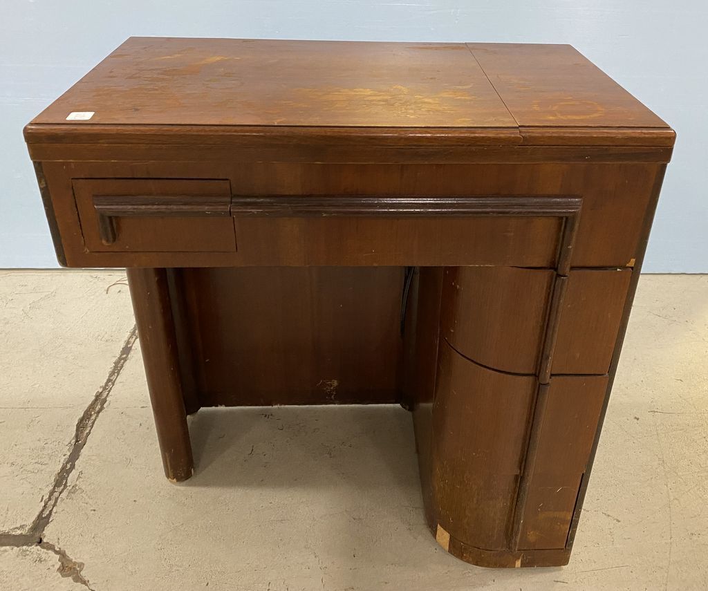 Art Deco Singer Sewing Cabinet. Includes a Singer sewing machine. Has missing veneer. 3 drawers, worn finish. 31"h., 29"w., 17"d. Art Deco Singer Sewing Cabinet. Includes a Singer sewing machine. Has missing veneer. 3 drawers, worn finish. 31"h., 29"w., 17"d.
