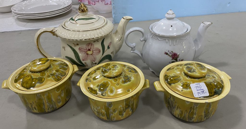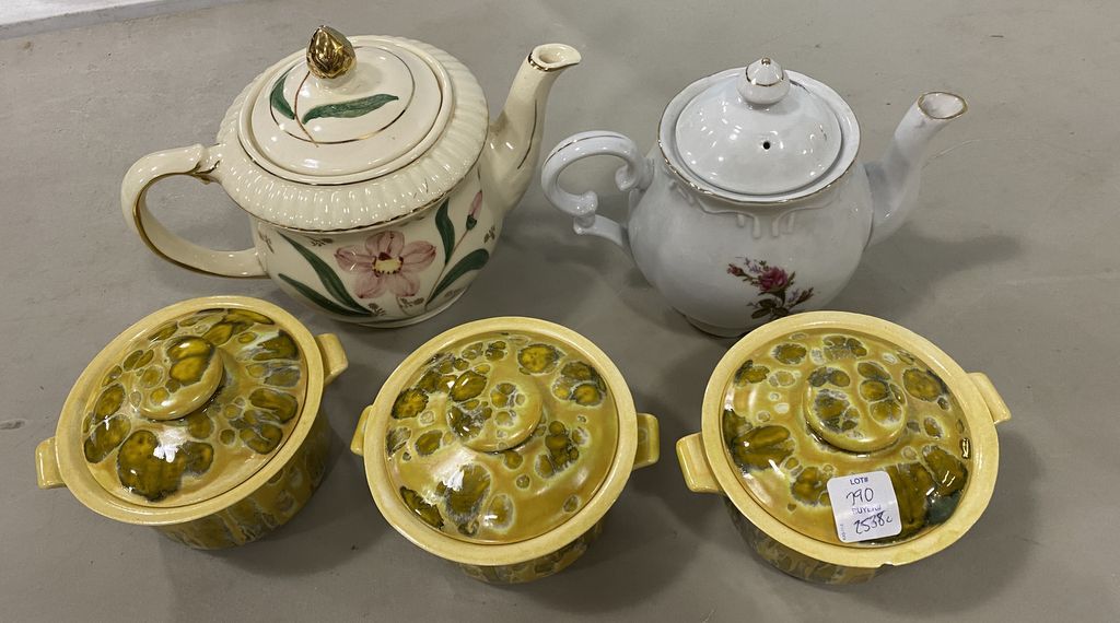 Two Porcelain Pitchers and Three Stoneware Pots, glazed. Two Porcelain Pitchers and Three Stoneware Pots, glazed.