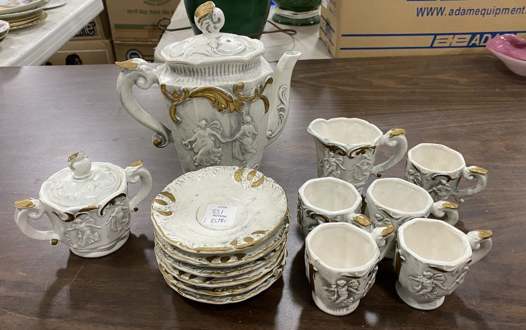 Ceramic Italian Style Tea Set, Pitcher, cups, saucers, creamer, sugar, hand painted. Ceramic Italian Style Tea Set, Pitcher, cups, saucers, creamer, sugar, hand painted.