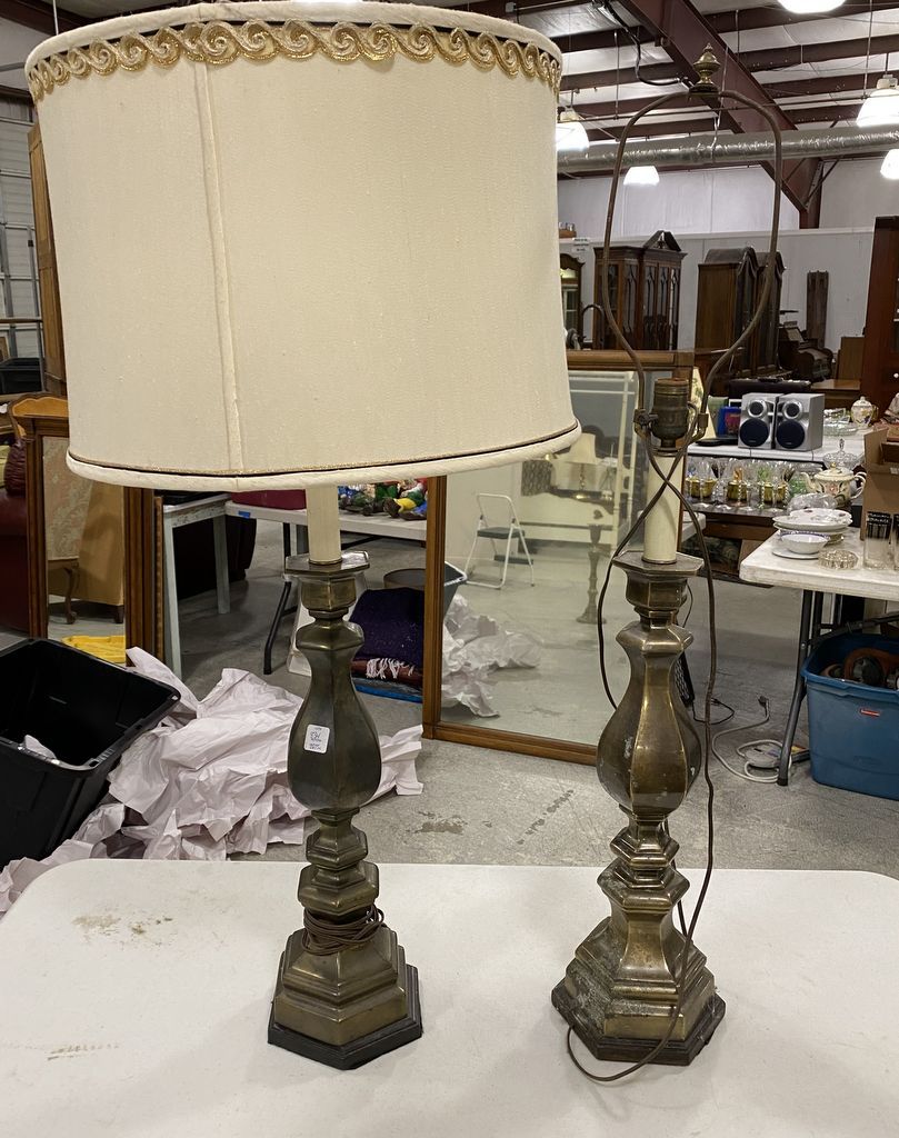 Pair of Brass Candle Stick Lamps, vintage, one missing shade, 40"h. Pair of Brass Candle Stick Lamps, vintage, one missing shade, 40"h.