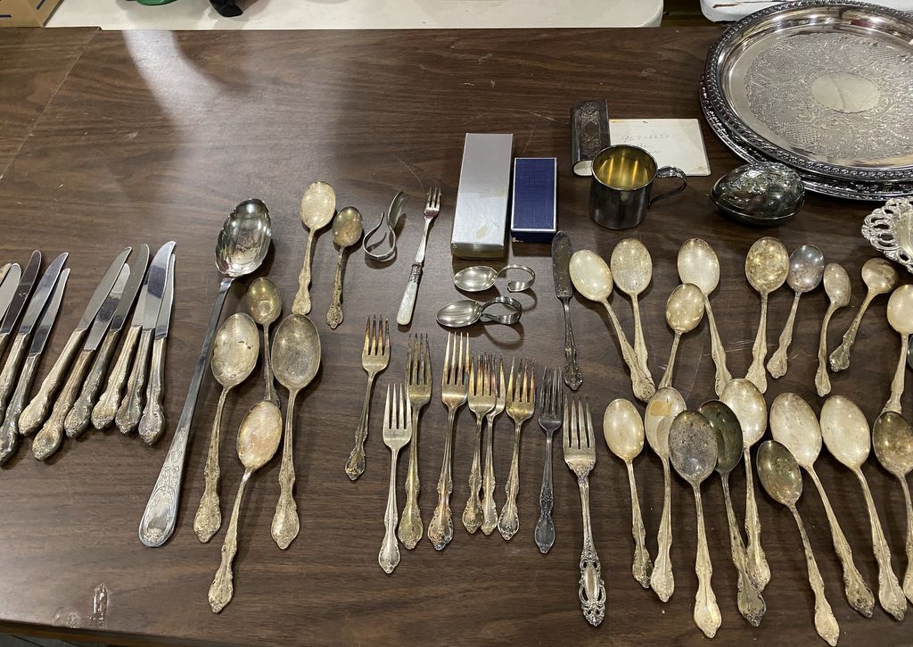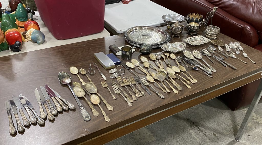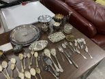 Group of Silver Plate Flatware and Serving Pieces, trays, creamer, tray, dishes, coasters, candle stand. Group of Silver Plate Flatware and Serving Pieces, trays, creamer, tray, dishes, coasters, candle stand.