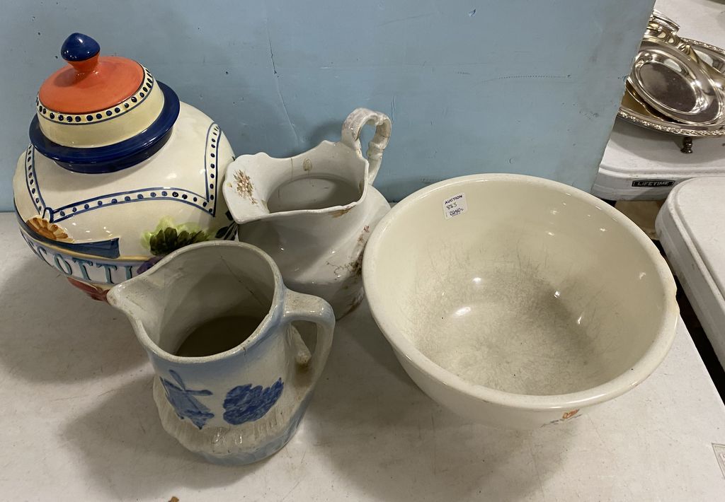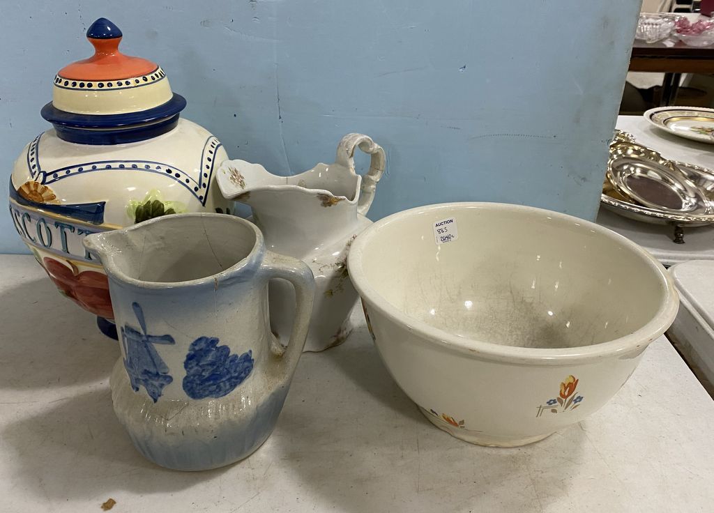 Four pottery pieces, Biscotti ceramic jar, stoneware pottery pitcher, porcelain pitcher, and porcelain salad bowl, has chips. Four pottery pieces, Biscotti ceramic jar, stoneware pottery pitcher, porcelain pitcher, and porcelain salad bowl, has chips.