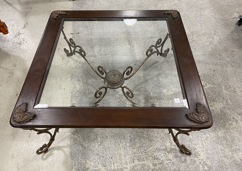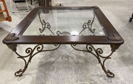 Modern Metal Base Coffee Table, metal base with wood top, beveled glass top, 17"h., 38"w. Modern Metal Base Coffee Table, metal base with wood top, beveled glass top, 17"h., 38"w.