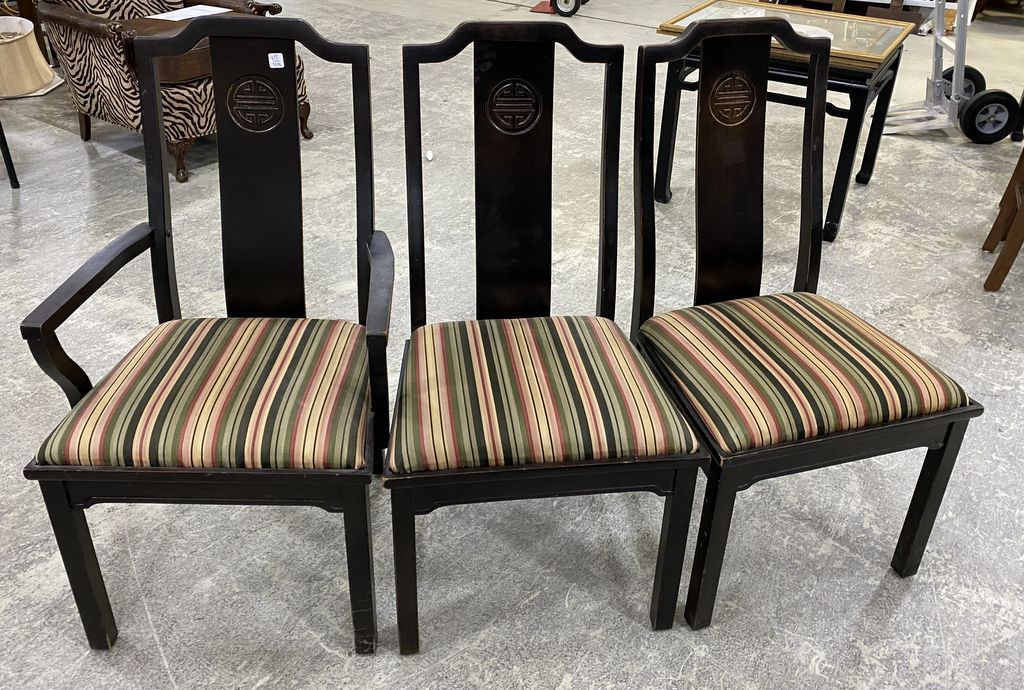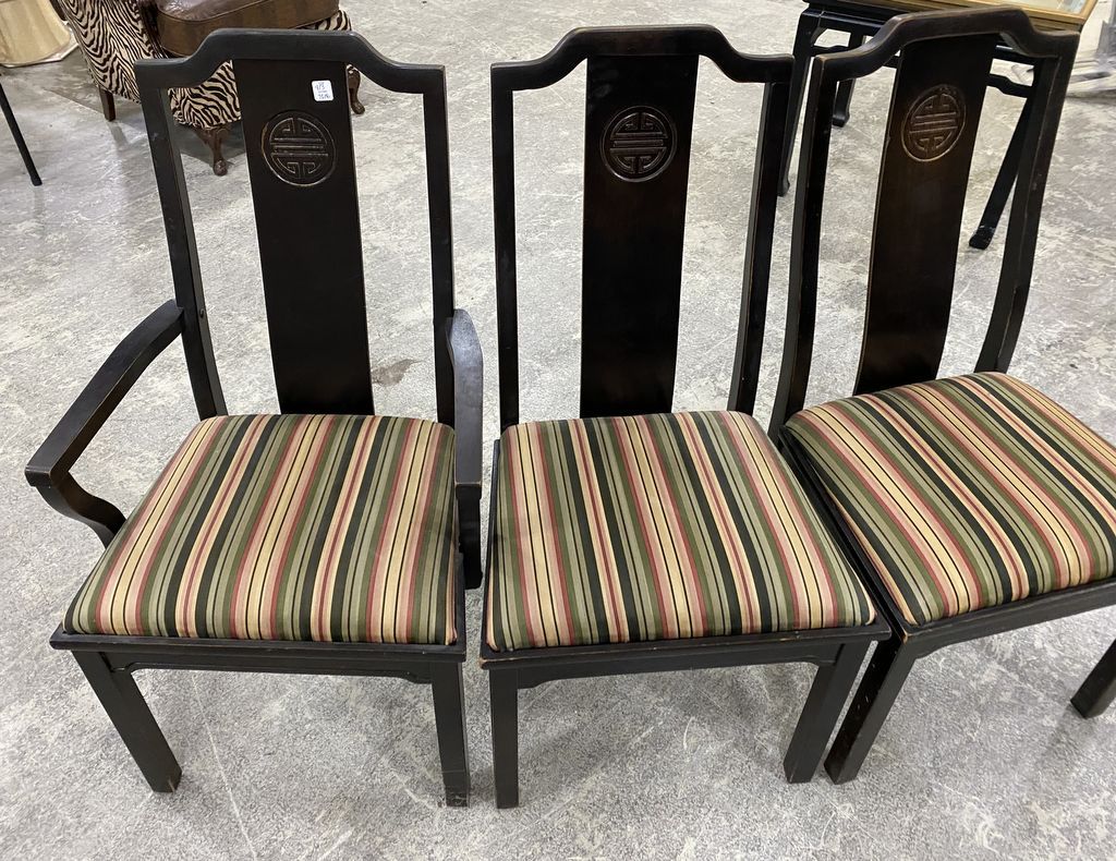 Three Oriental Style Dining Chairs, two sides, and arm chair, striped fabric cushion. Three Oriental Style Dining Chairs, two sides, and arm chair, striped fabric cushion.