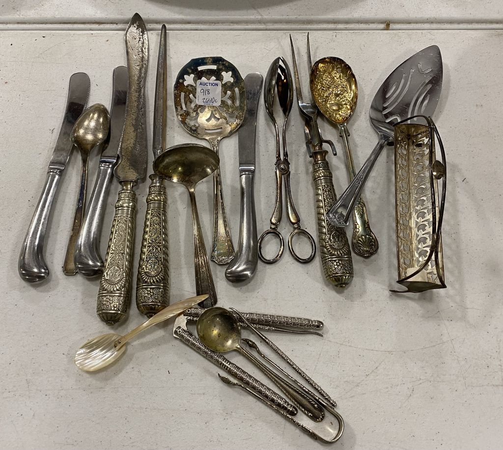 Silver Plate Flatware Pieces, carving sets, sugar tray, spoons, tongs. Silver Plate Flatware Pieces, carving sets, sugar tray, spoons, tongs.
