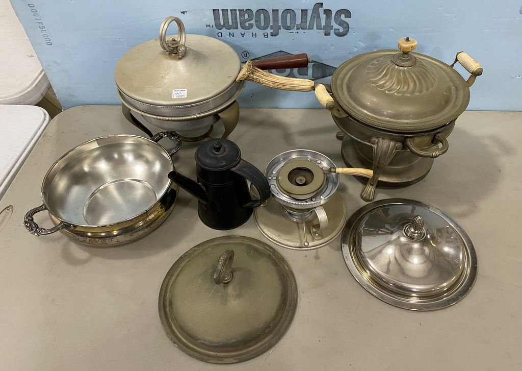 Two Warmer dishes, one with antler style handled, warmer stand, and black pitcher. Two Warmer dishes, one with antler style handled, warmer stand, and black pitcher.