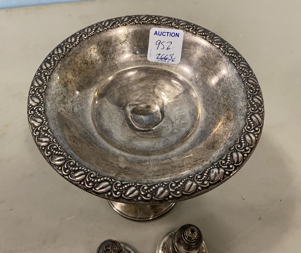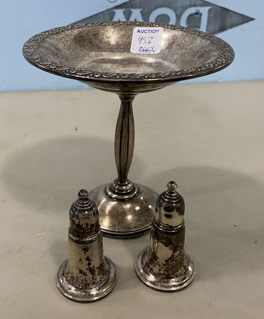 Weighted Sterling Compote, has dents, 6"h. and Weighted Salt & Pepper Weighted Sterling Compote, has dents, 6"h. and Weighted Salt & Pepper