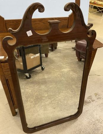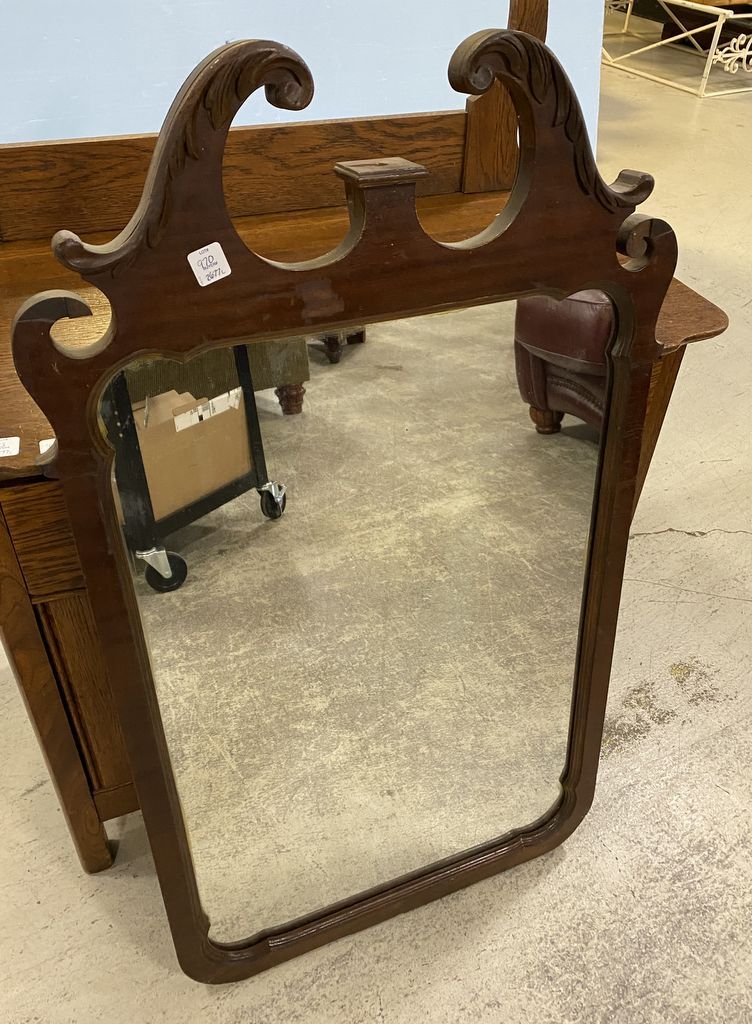 Mahogany Broken Pediment Crest Mirror, missing finial, has age wear, 39"h., 23"w. Mahogany Broken Pediment Crest Mirror, missing finial, has age wear, 39"h., 23"w.