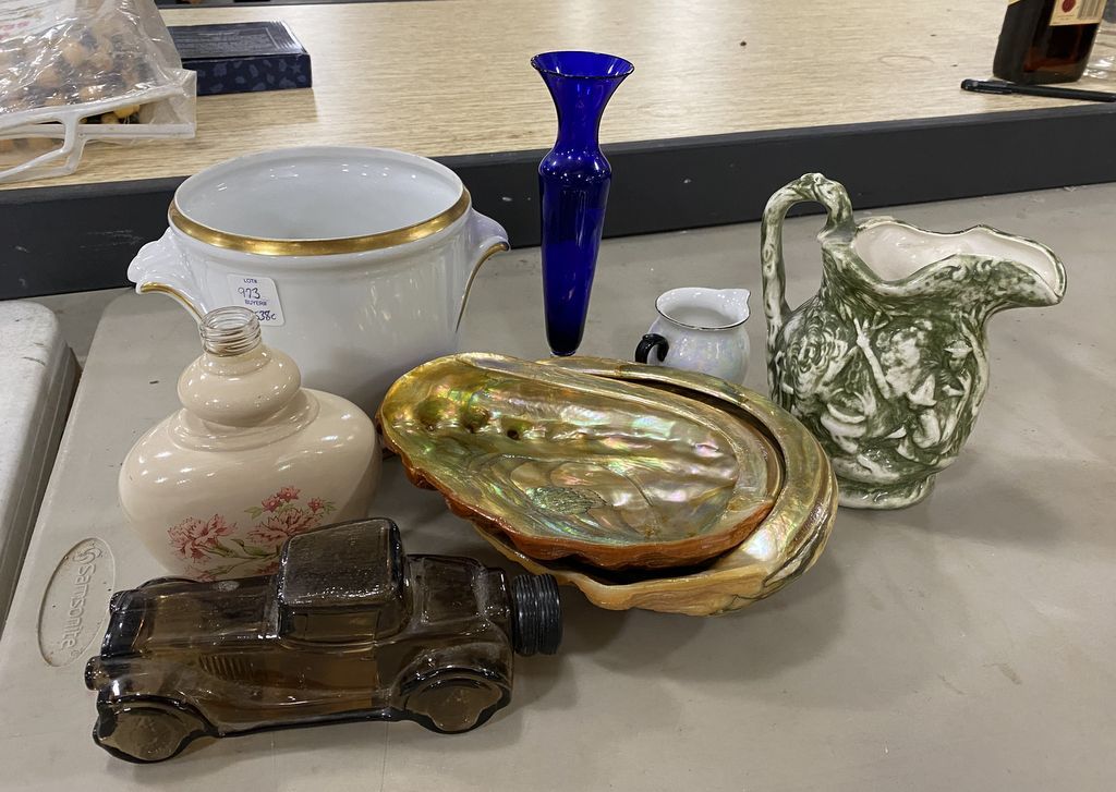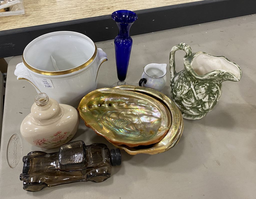 Group of decorative pieces, ceramic pitcher, porcelain vase, shell decor, glass car perfume. Group of decorative pieces, ceramic pitcher, porcelain vase, shell decor, glass car perfume.