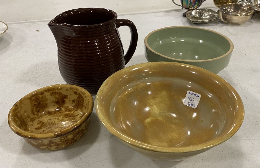 Stoneware pitcher, bowls, and Yellow ware hand crafted bowl, signed. Stoneware pitcher, bowls, and Yellow ware hand crafted bowl, signed.