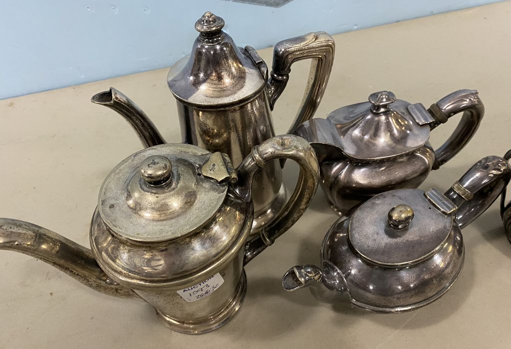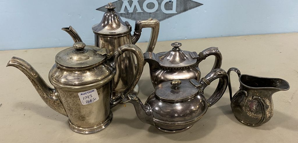 Group of Silver Soldered Serving Pieces, Reed & Barton Pitcher, Governor Clinton pitcher, R. Wallace pitcher, Hotel Essex pitcher, Reed & Barton small pitcher. Group of Silver Soldered Serving Pieces, Reed & Barton Pitcher, Governor Clinton pitcher, R. Wallace pitcher, Hotel Essex pitcher, Reed & Barton small pitcher.