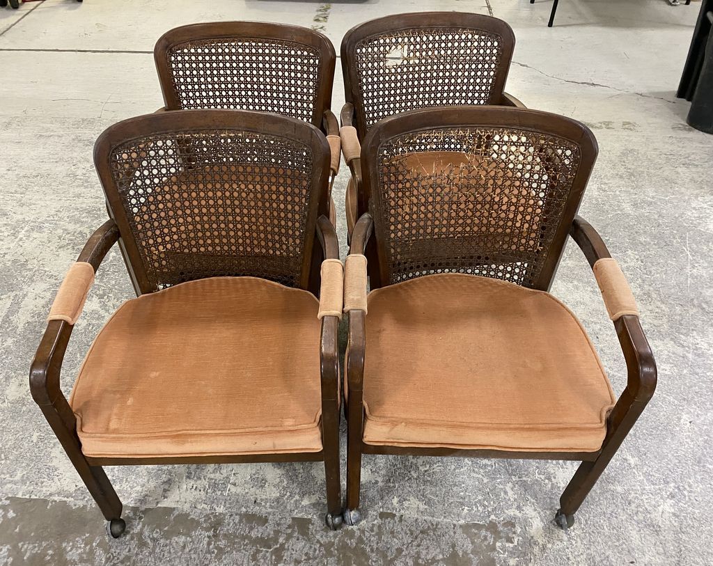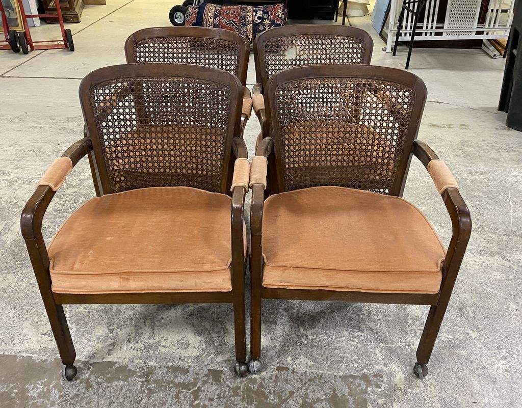 Four of Caned Back Chairs, two with damaged cane, on casters. Four of Caned Back Chairs, two with damaged cane, on casters.