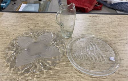 1130 Pressed Glass Center Piece, Christmas Charger, and Etched Glass Pitcher