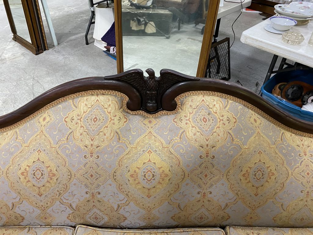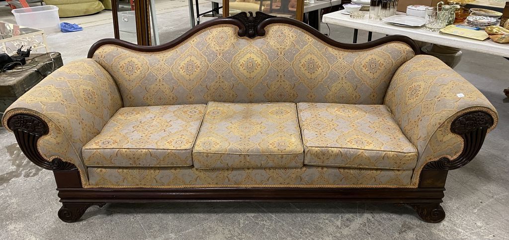 Early 1900's Empire Style Sofa, three cushion, carved eagle emblem, design pattern, 7'. Early 1900's Empire Style Sofa, three cushion, carved eagle emblem, design pattern, 7'.