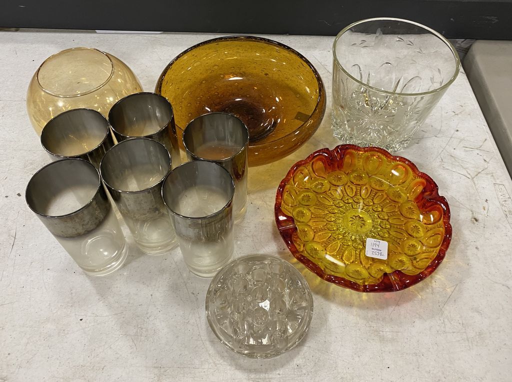 Silver plate rimmed glasses, bubble glass bowl, ash tray, frogger, vase. Silver plate rimmed glasses, bubble glass bowl, ash tray, frogger, vase.