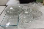 Group of Serving Glassware. 3 pyrex dishes, torte plate, divided serving dish, press glass candy dish, and fruit bowl Group of Serving Glassware. 3 pyrex dishes, torte plate, divided serving dish, press glass candy dish, and fruit bowl