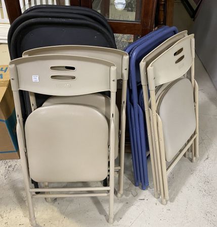 Group of Folding Chairs, tan, black, blue, Cosco. Group of Folding Chairs, tan, black, blue, Cosco.