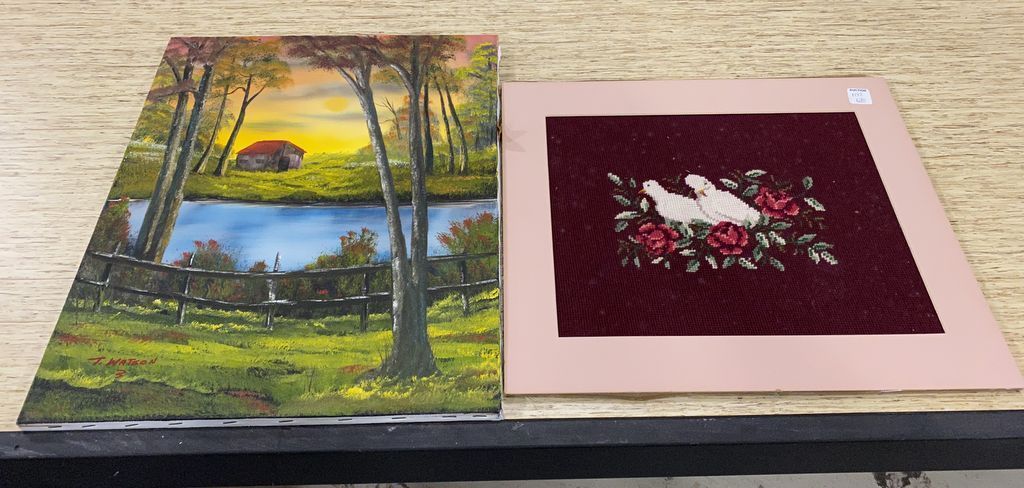 T. Watson Landscape Painting and Needle Point Doves, 16"h., 18"w. T. Watson Landscape Painting and Needle Point Doves, 16"h., 18"w.