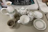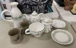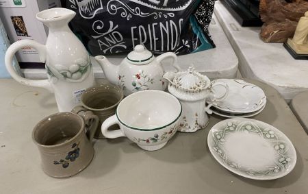 Group of Porcelain and Pottery, pitcher, creamer, stoneware mugs, small plates, and corked pitcher. Group of Porcelain and Pottery, pitcher, creamer, stoneware mugs, small plates, and corked pitcher.
