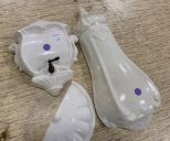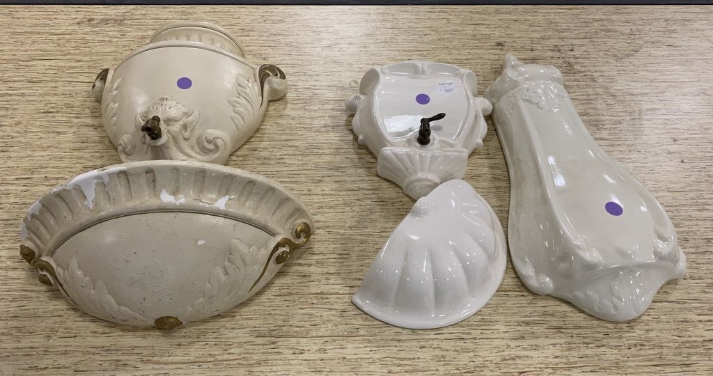 Two Ceramic Wall Lavabos, three piece white, and two piece antique white, chipping, wall mounted. Two Ceramic Wall Lavabos, three piece white, and two piece antique white, chipping, wall mounted.