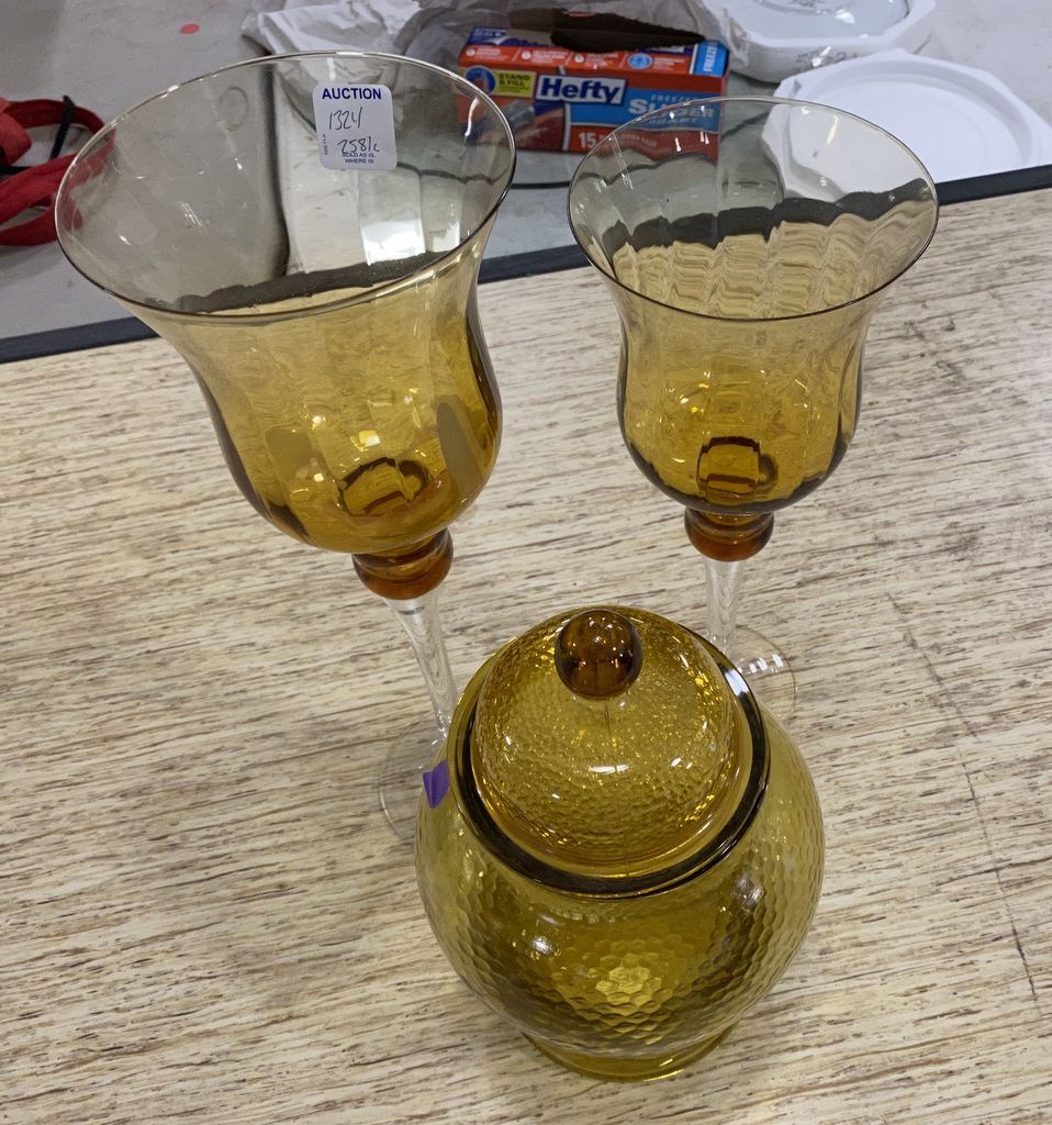 Two Tall Amber Glass Goblets 14"h. and Amber Art Glass Jar Two Tall Amber Glass Goblets 14"h. and Amber Art Glass Jar