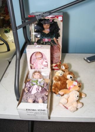 Violet Petal porcelain 14" h. doll in box, Kewpie as Cinderella in box, Collectors choice porcelain 19" h. doll in the box & five small stuffed bears Violet Petal porcelain 14" h. doll in box, Kewpie as Cinderella in box, Collectors choice porcelain 19" h. doll in the box & five small stuffed bears