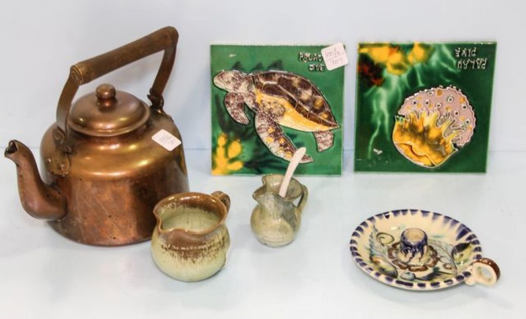 North State North Carolina pottery creamer (chipped), small creamer, Mexico pottery candlestick, two tiles & copper kettle North State North Carolina pottery creamer (chipped), small creamer, Mexico pottery candlestick, two tiles & copper kettle