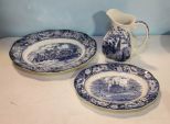 English blue and white pottery, Liberty Bell pitcher 7 1/2" h., Liberty Bell platter 12" w. and Liberty Bell platter of Washington crossing the Delaware 14" w. English blue and white pottery, Liberty Bell pitcher 7 1/2" h., Liberty Bell platter 12" w. and Liberty Bell platter of Washington crossing the Delaware 14" w.