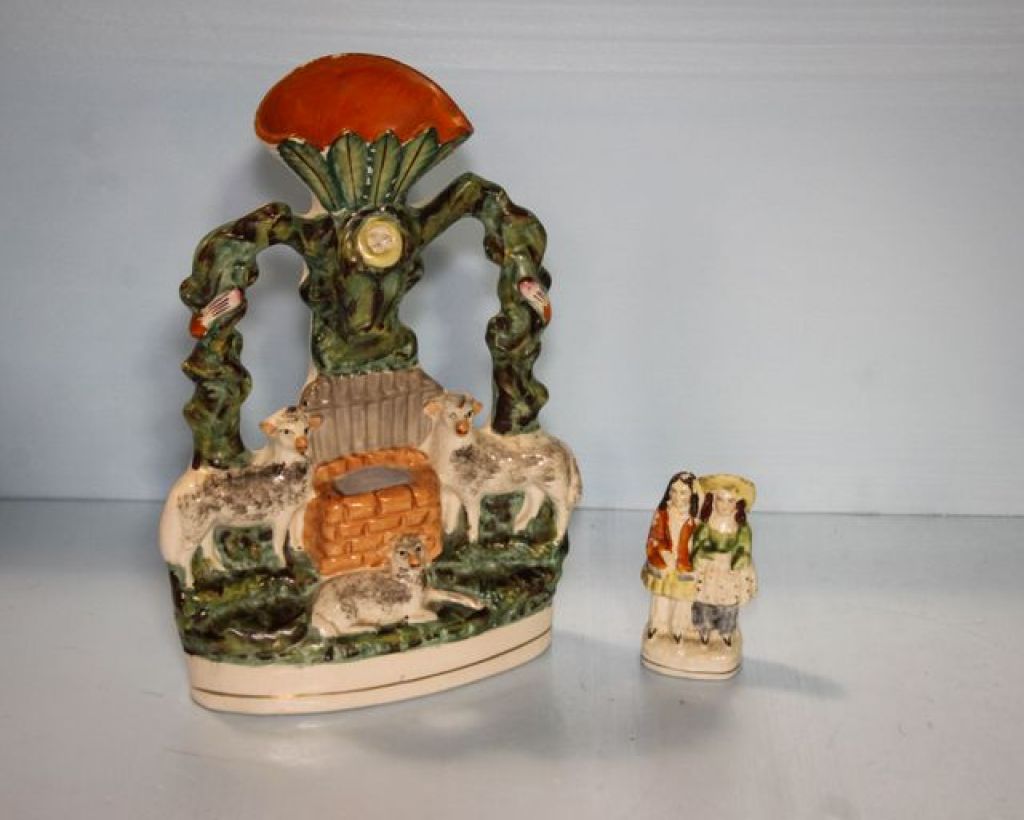 Lady and gent Staffordshire figurine 4 1/2" h., Staffordshire figurine of lambs & vase 13" h. Lady and gent Staffordshire figurine 4 1/2" h., Staffordshire figurine of lambs & vase 13" h.