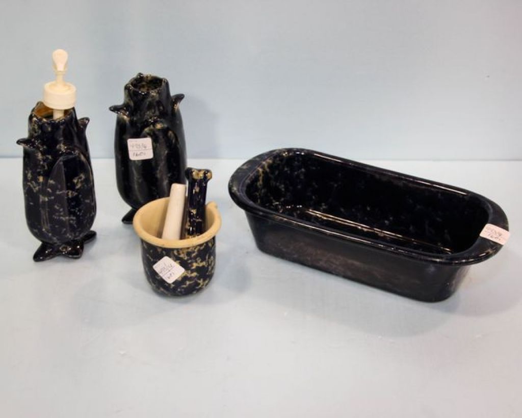 Two spongeware dispensers, mortar/pedestal & bread tray Two spongeware dispensers, mortar/pedestal & bread tray