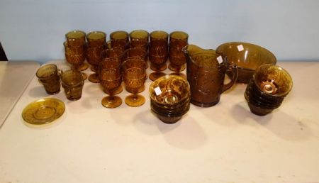 Six amber glasses, pitcher, punch bowl, four cups, one plate & thirteen berry bowls Six amber glasses, pitcher, punch bowl, four cups, one plate & thirteen berry bowls