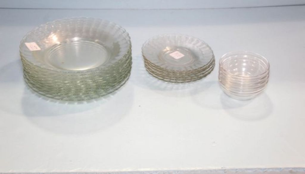 Eleven glass salad plates, six glass saucers & five glass 4" dia. liners Eleven glass salad plates, six glass saucers & five glass 4" dia. liners