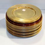 Fifteen 13" dia. gold plastic chargers, six red tin plates and six gold chargers Fifteen 13" dia. gold plastic chargers, six red tin plates and six gold chargers